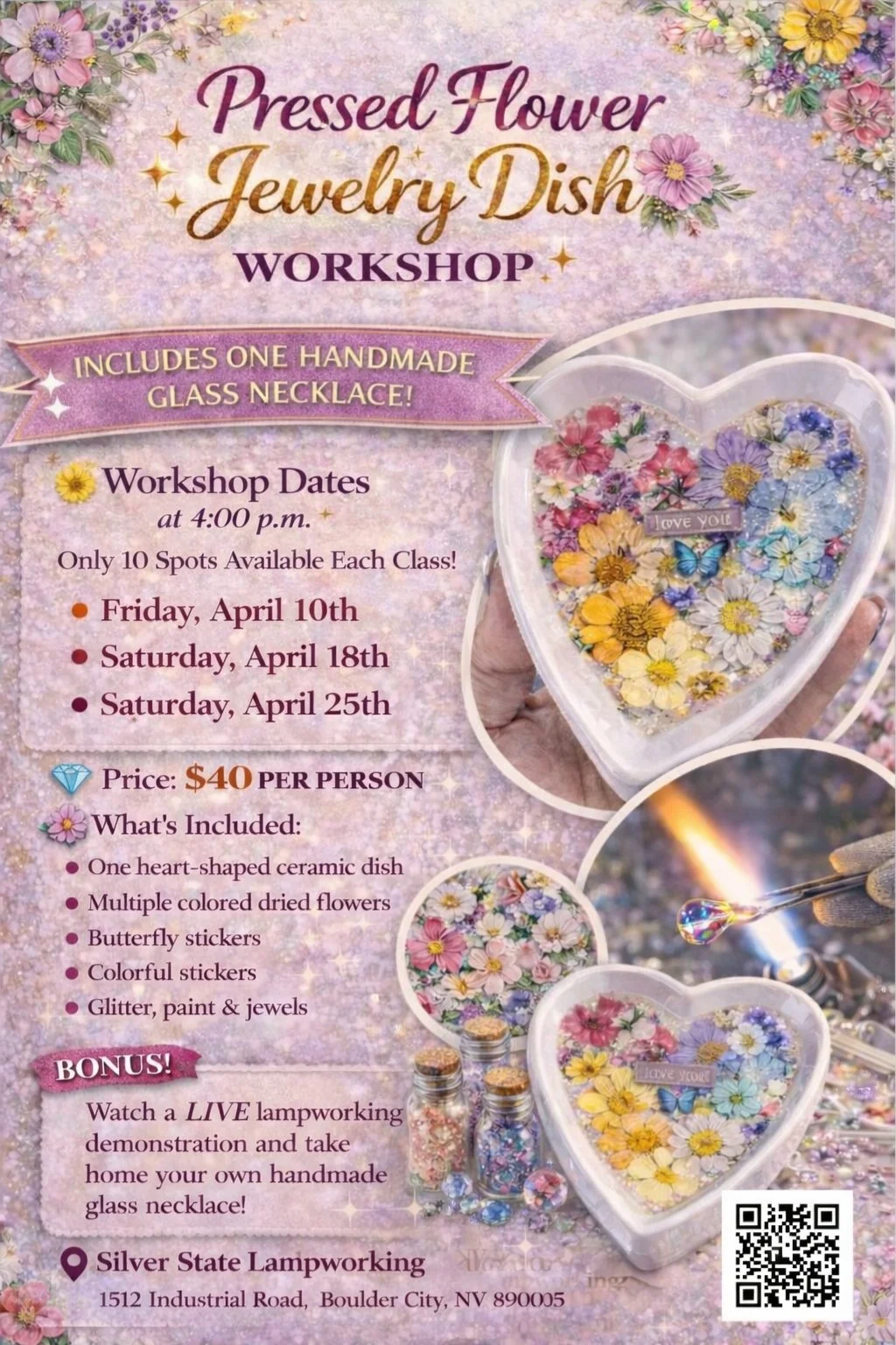 Create your very own pressed flower resin jewelry dish and watch a live glassblowing demonstration!
